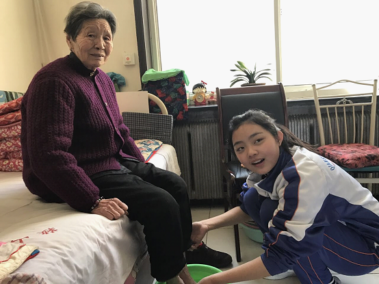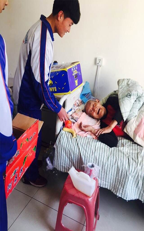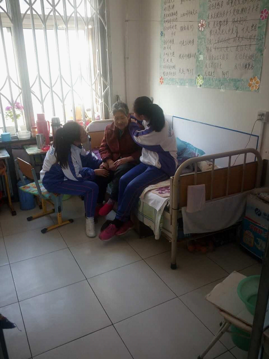 剛到敬老院的老師和同學(xué)們便立即的行動起來,他們分組為老人們清掃房間,給老人們梳頭、捶背,洗腳。并且滿懷熱情地走到老人的身邊,問寒問暖,講述幽默風(fēng)趣的故事。一位99歲高齡的爺爺激動地說:“孩子們來這里給我們打掃衛(wèi)生、疊被子、拉家常,我很高興”??吹嚼先藗兡樕涎笠绲臓N爛笑容,孩子們也會心地笑了,整個敬老院充滿了歡聲笑語。