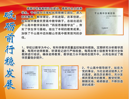 最后,觀摩檢查組的領(lǐng)導(dǎo)針對(duì)本次對(duì)我校的觀摩檢查做了總結(jié)講話(huà),贊揚(yáng)我校所取得的教育教學(xué)成果是辦學(xué)的真正特色,同時(shí)對(duì)我校的未來(lái)寄予厚望。相信千山高中的未來(lái)一定會(huì)更加輝煌!