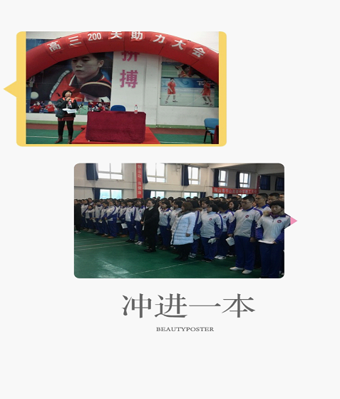 首先,由高三所有的班主任上臺發(fā)表激情洋溢的講話,他們不僅指出了本班同學目前存在的不足,更對全班同學沖刺階段的學習、生活提出了具體要求,并希望全班同學凝聚全部的力量,珍惜時間,用拼搏成就自己的理想,用優(yōu)異的成績向學校和家長回報。