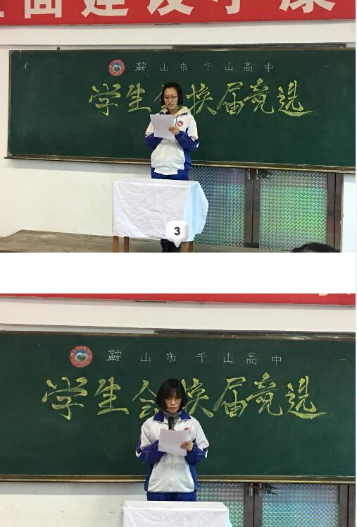本次競選大會在郭陽老師的主持下拉開了帷幕。郭老師首先感謝一年來校領(lǐng)導(dǎo)的大力支持并介紹了本次競選的目的——選出認(rèn)真務(wù)實、有思想、有責(zé)任的優(yōu)秀學(xué)生擔(dān)任學(xué)生會干部,為同學(xué)們服好務(wù),搭建好學(xué)生自我管理的平臺。