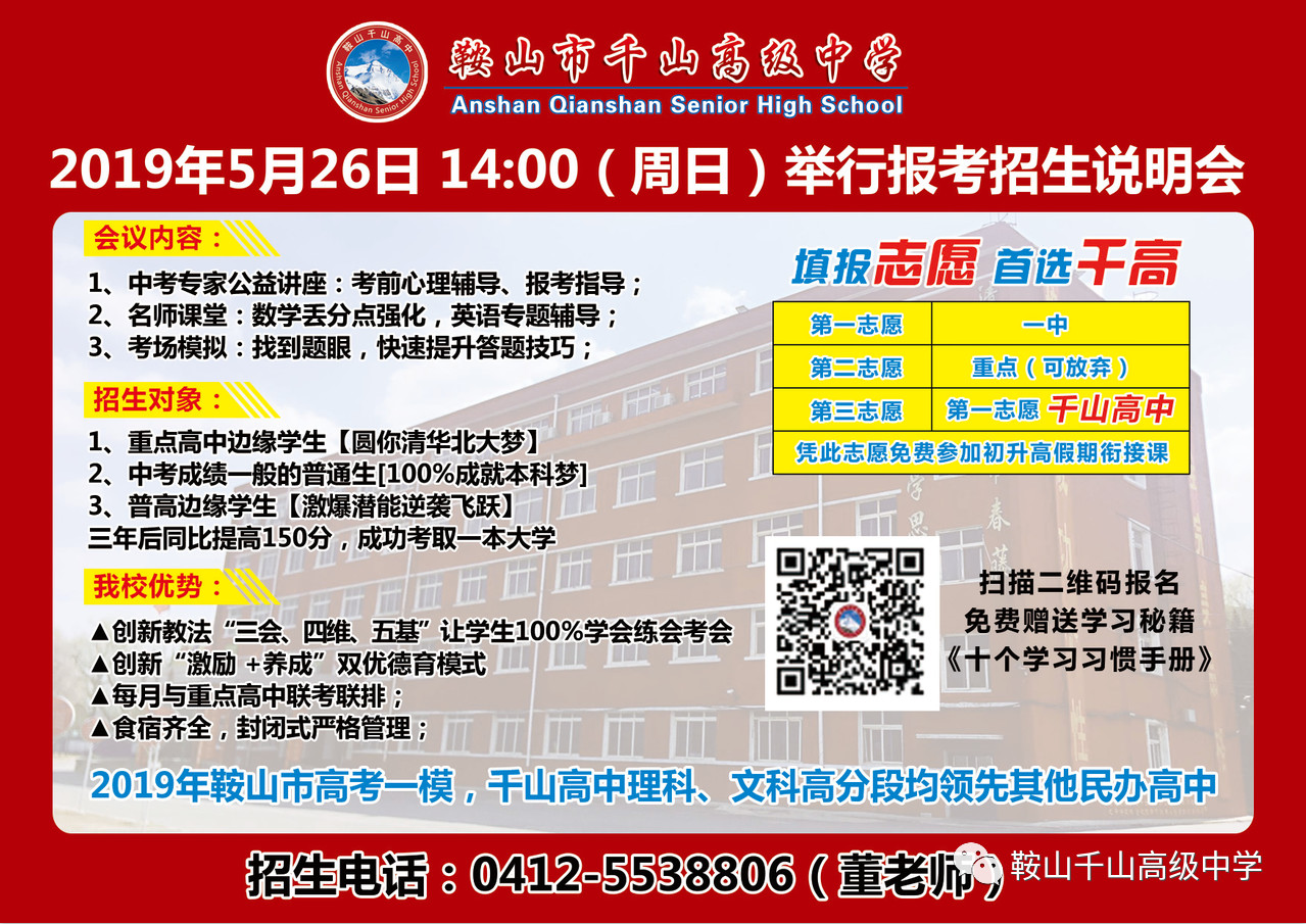 2019年5月12日和5月19日下午2點(diǎn),鞍山市千山高中在校體育館分別舉辦兩場中考報(bào)考招生說明會。