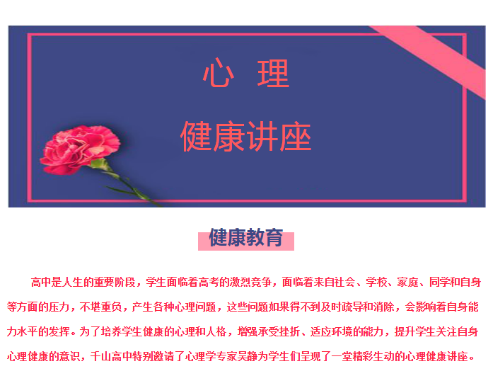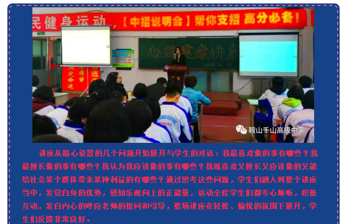 鞍山市千山高級中學----命運掌握在自己手中 ——心理學專家吳靜來我校為學生做心理健康講座